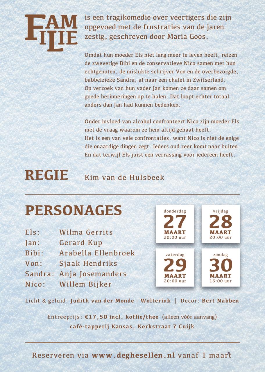 Familie is een tragi-komedie over veertigers die zijn opgevoed met de frustraties van de jaren zestig, geschreven door Maria Goos.