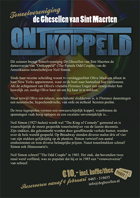 In 2013 bracht Toneelverenigng De Ghesellen van Sint Maerten de damesversie van “Ontkoppeld” (The Female Odd Couple) van de Amerikaanse toneelschrijver Neil Simon. Sinds haar recente scheiding woont tv-verslaggeefster Olive Madison alleen in haar New Yorks appartement, waar ze de boel naar hartenlust laat verslonzen. Als de echtgenoot van Olive’s vriendin Florence Unger een streep onder hun huwelijk zet, nodigt Olive haar uit om bij haar in te trekken. Maar terwijl Olive een relaxte, nonchalante sloddervos is, is Florence daarentegen een neurotische, hypochrondische, van orde en netheid bezeten pietlut. De twee tegenpolen vormen een onwaarschijnlijk koppel, waarbinnen de spanningen vaak hoog oplopen en een escalatie onvermijdelijk is… Neil Simon (1927-heden) wordt wel “The King of Comedy” genoemd en is waarschijnlijk de meest gespeelde toneelschrijver van de laatste decennia. Zijn stukken, die gekenmerkt worden door geraffineerde verbale humor, worden over de hele wereld gespeeld. Op Broadway stonden diverse malen drie of vier van zijn stukken gelijktijdig op de planken. Simon verwierf een aantal eredoctoraten en won diverse belangrijke prijzen. Naast toneelstukken schreef Simon ook filmscenario’s. Niel Simon schreef “The Odd Couple” in 1965. Het stuk, dat bovendien twee maal werd verfilmd, was zo populair dat hij er in 1985 een “vrouwenversie” van schreef.
